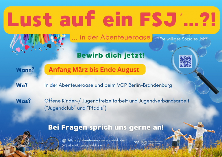 🌟 Lust auf ein FSJ in der Abenteueroase? Du möchtest dich praktisch ausprobieren und mit Kindern und Jugendlichen arbeiten? Dann komm zu uns in die Abenteueroase und zum VCP Berlin-Brandenburg! 📅 Zeitraum Anfang März bis Ende August 📍 Einsatzorte In