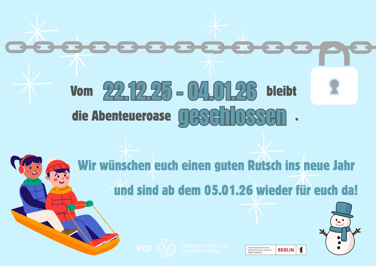 Liebe Besucher*innen,die Abenteueroase macht vom 22.12.2025 bis zum 04.01.2026 Winterpause. In dieser Zeit bleibt unsere Einrichtung […]